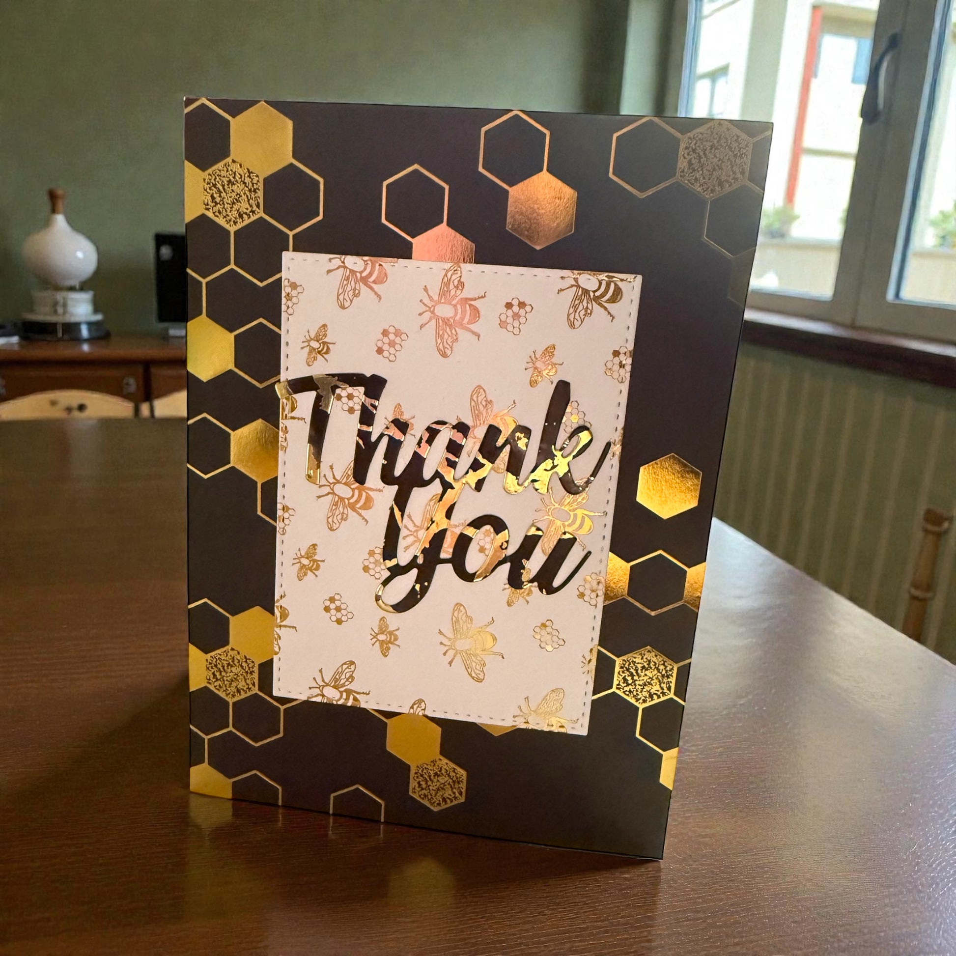 Send your best wishes with this handcrafted thank you card featuring an elegant bee design in striking gold and black. Measuring 5x7 inches, this card offers ample space for your personal message on its blank interior. Perfect for expressing appreciation to friends, family, or colleagues, each card is meticulously made by hand, ensuring a unique and thoughtful touch. The sophisticated colour palette makes it suitable for any occasion, from professional acknowledgments to heartfelt personal notes.